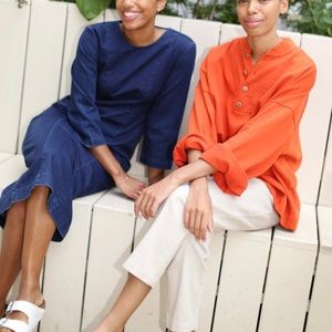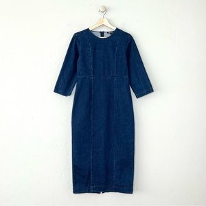 Beautiful indigo blue denim dress with 3/4 sleeves and a straight midi hem. Zipper closure, crew neckline, back slit, tailored style without stretch.