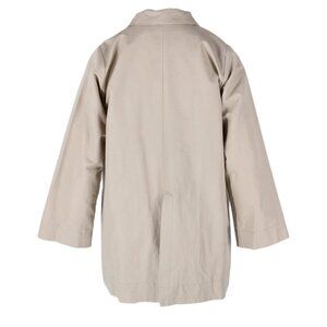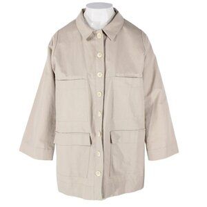 Beige linen/cotton blend lightweight jacket. Features 4-pocket front, cropped sleeves, and deep back vent with off-white marbled front button closure. Unlined.