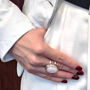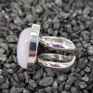 A modern style ring from Peruvian designer Ilaria. This ring features a light pink, rose quartz stone set in sterling silver. finger size is approx 6.25, but is open on bottom to be slightly adjustable.