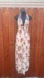 Elegant floral halter maxi dress in cream with beautiful red and blue accents. Perfect for any occasion. Backless with braided back strap cut out in front and deep plunging v-neck.