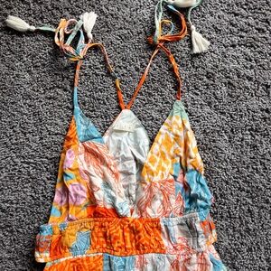 Super cute and unique patchwork jumpsuit with Beachy designs. Originally purchased at a Ron Jon’s surf shop. Size M with 30.5” inseam. Never worn, just not my style. Side cutouts and tie back halter top. So beautiful and fun for beach outings and just summer in general. Open to offers and willing to answer any questions!