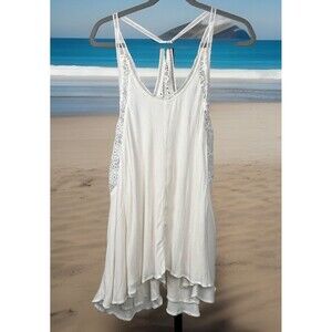 Illa Illa designer dress in size small. Sleeveless Y-back pullover in a white gauze-like fabric with feminine floral crochet open sides and back and matching crochet neckline and straps. Flattering layered flowy mini sundress with a longer back silhouette in soft, breathable, lightweight 100% rayon (polyester trim). Timeless summer dress perfect as a beach coverup, resort and cruisewear sundress, or pair with boots for boho chic, coastal cowgirl, or cottagecore wardrobes.