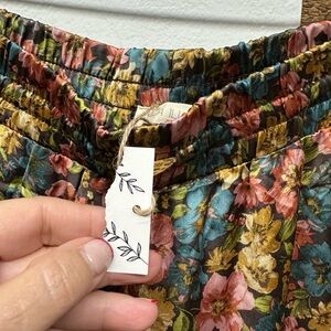 Beautiful bohemian-style floral pants by Illa Illa. These lightweight pants feature a vibrant all-over floral print with shades of teal, pink, yellow, and coral against a dark background. Designed with an elastic waistband for comfort, side pockets for practicality, and a wide-leg silhouette that flows effortlessly. Fully lined for comfort.