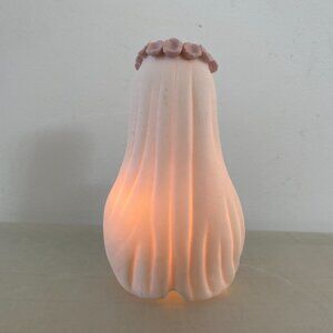 Beautiful & delicate white porcelain sculpture of the Virgin Mary holding pink roses and with a light pink rose crown. It can be displayed illuminated or not. Please note that the bulb socket is not cracked, but, due to age, it does separate a bit when the bulb is inserted. It may be better to replace the socket. Please see photos. Lightbulb not included. Sculpture condition is ‘Like-new. Socket condition is ‘Pre-owned’; replacement recommended. Size: Height: 6”; Width: 3”; Depth: 3 ½”.