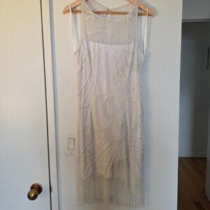 Cute illusion neckline fitted short dress embellished with beads and beaded fringes. You just found your bridal shower, bachelorette or new years eve dress!