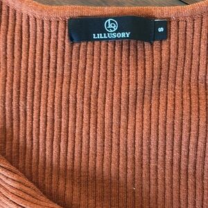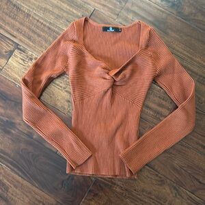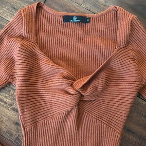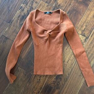 EUC. Stylish brown ribbed fitted top with long sleeves. Features a unique twist front design. Material has lots of stretch. Bodycon. Size small. Measurements see photos.