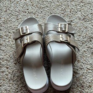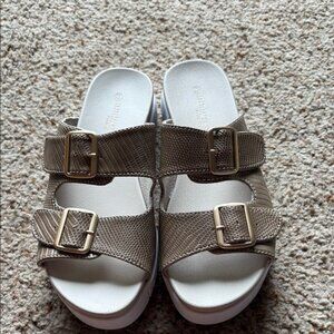 Trendy tan slide sandals featuring a textured design and white soles. Perfect for casual wear. Size 37. More or less what I would consider brand - only worn in store when trying on