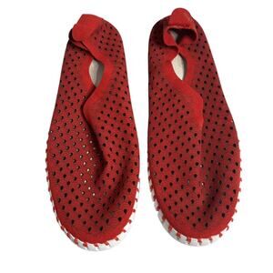 Ilse Jacobsen Tulip 139 Slip On Shoe in Red. Size 39 (US 8). Features round toe, faux leather upper, perforated laser cut design, rubber outsole, and slip-on style. Excellent pre-owned condition.