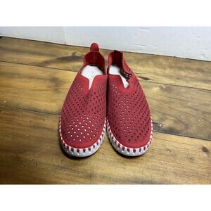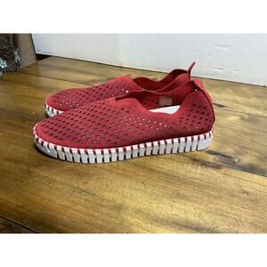 Add a pop of color to your wardrobe with these Ilse Jacobsen Tulip 3373 platform slip-on shoes in a deep red hue. Crafted from high-quality microfiber material, these shoes are not only stylish but also comfortable and breathable, making them perfect for everyday wear. The closed-toe design and cushioned insole with foam material provide a comfortable fit, while the rubber outsole ensures durability and grip on any surface. These shoes are available in EU size 38 and US size 7.5 with a medium shoe width. Ideal for women who want to add a touch of elegance to their casual outfit, these flats are a must-have in your shoe collection.new without tags out tags we ship fast