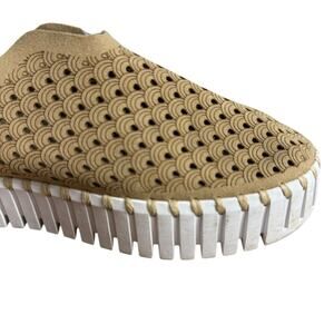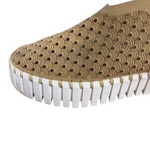 The Ilse Jacobsen Tulip Latte Beige Platform Suede Perforated Slip On Shoes in size 37 (6.5) are a stylish and comfortable option for women. Featuring a geometric pattern and round toe shape, these flats are perfect for casual or travel occasions. The slip-on design, cushioned features, and rubber outsole provide easy wear and additional comfort. Made with microfiber suede lining and upper material, these Ilse Jacobsen shoes are a fashionable choice for the summer, fall, and spring seasons.