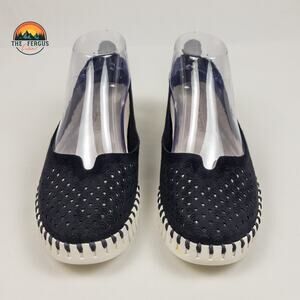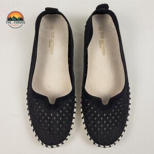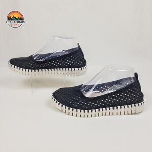 Ilse Jacobsen Tulip slip-on comfort sneakers, women's size 6 (EU 36). Black perforated fabric with white ribbed sole.