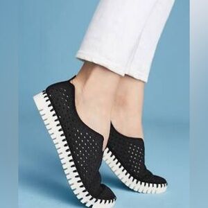 Stylish black slip-on shoes with perforated design. Comfortable and chic. Loved for their signature comfort and timeless appeal, these flats are our bestselling icon — reimagined in a lightweight, feminine design. Crafted from recycled microfiber with a delicate laser-cut pattern, they offer effortless style with every step. The flexible Tulip outsole is stitched with colour-matched recycled thread using no glue, reflecting our thoughtful approach to design. Inside, the softly padded insole ensures all-day support, making these flats a go-to favourite season after season.