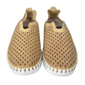 Scalloped embossing frames all-over perforations on the upper of a super-comfortable slip-on that's whipstitched to a flexible rubber sole.