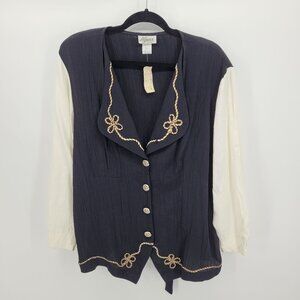 Ilyza New York Womens size 16 Black white button up NWT Deadstock There are a couple spots on the lighter part and on the back color may appear differently depending on light Marching Band vibes tan stitching button up v neck flower buttons
