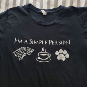 This product is a black short sleeve T-shirt in juniors size small. It features a graphic of "Im A Simple Person, GOT, Coffee, Dogs" on the front. The shirt is made of 100% cotton jersey fabric with a round neck and pullover closure. It is perfect for casual occasions and can be worn in all seasons. The shirt is easy to care for, stretchy, and has a regular fit. It is machine washable and has a casual sleeve length. The brand is Bella + Canvas and it was manufactured in Honduras.