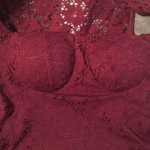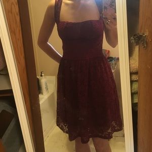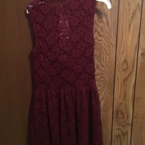It's a beautiful Burgundy dress just above the knees with a built in bra and it is see-through on the back. It has a flower pattern in the material.