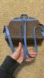 This brown and blue backpack bag is in good condition minus little scratches at the bottom! It’s cream on the inside with gold accents!