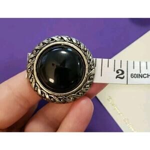 These are clip on earrings with a large round black lucite cabochon center stone set on a round ornate design antiqued silver tone plastic material. They have shiny silver tone metal clip on back closures. The backs of the plastic look dirty, but were purposefully made that way to look tarnished/antiqued. The lucite cabochans have some very minor surface scratches that are hard to see. Tgey measure 1 3/8" in diameter. These are pre-owned and may have minor wear, but still in good condition.