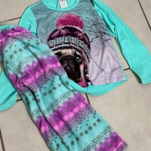 Cozy kids pajamas featuring a playful dog print. The set includes a blue top and purple-striped pants, perfect for bedtime fun. Imagine Girls Green Pajama puppy Set Winter size S. Slightly used. Excellent condition. Smoke free home. No issues.