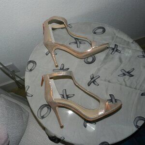 Imagine Vince Camuto Phoebe T-Strap Rose Gold Shimmer Satin Heels. Open toe. T-strap style with zip back closure. Shimmer detailing. Rose Gold hardware. Comes with box and dust bag. See pictures for additional description.