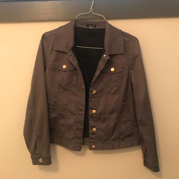 Stretchy and soft denim-like jacket with gold tone buttons and open pockets in the front. Relaxed fit.