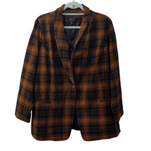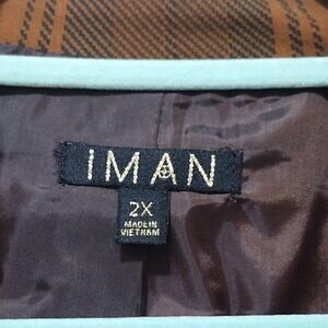 Step out in style with this stunning IMAN 2pc plaid pantsuit in Size 2X, featuring rich tones of burnt orange, brown, and black. This fully lined single-breasted blazer has a single button closure, notched lapel collar, long sleeves, and two front welt pockets. The matching pull-on straight leg trousers with flat front waistband offers a tailored appearance. The autumn-inspired palette is perfect for the season and easily pairs with your favorite accessories. Whether you're heading to the office, a special event, or simply want to elevate your everyday wardrobe, this bold plaid set makes a statement while staying classic and versatile. Add this classic yet contemporary IMAN pantsuit to your closet for a look that’s as comfortable as it is fashionable. Don’t miss out on this wardrobe essential!