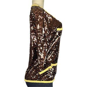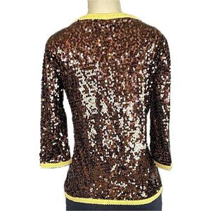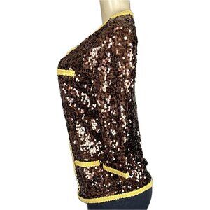 ITEM: Iman S Brown Metallic Mesh Sequin Yellow Crochet Accent 3/4 Sleeve Topper Jacket
