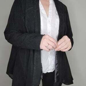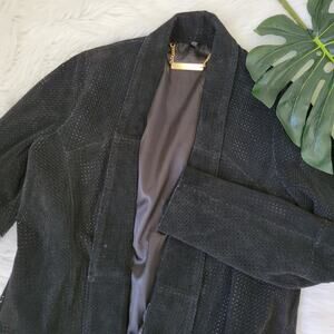 Iman Suede Laser Cut Blazer - Size small - Black suede blazer - longer in the front - chain tag - great pre-owned condition with small stain on lapel, see last pic - no material tag