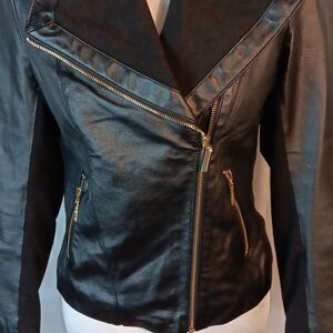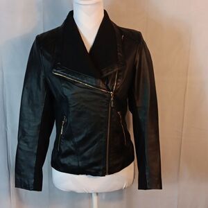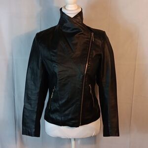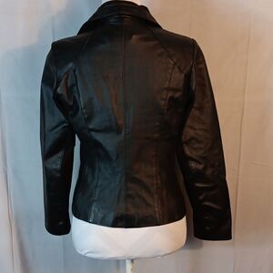 Elevate your style with this sleek black leather jacket. Size XS with a pit to pit measuring 18.5" and a length of 22". Perfect for any occasion, it offers a chic and modern look.
