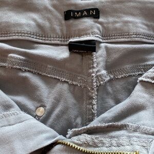 Iman gray jeggings. Stretch denim twill (98% cotton 2% spandex) for a comfortable great fit. Classic 5 pocket style. Trimmed in IMAN signature goldtone logo plate and rivet detail .Goldtone has some tarnish on it otherwise excellent preowned condition.