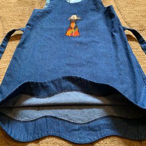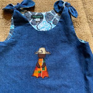Denim dress with 100% African fabric used inside of the dress for lining and for little girl applique on front of dress. Should tie can be adjusted to shorten or lengthen the dress. Scalloped hem, and tie back bow finishes off this beautiful dress. Size: large, armpit-to-armpit 14", armpit-to-hem 20". #8