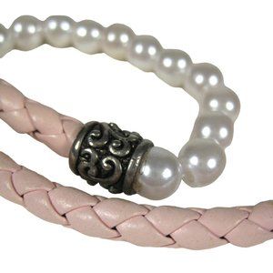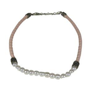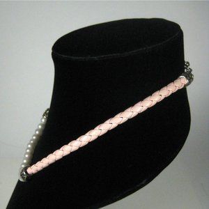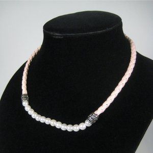 Imitation Pearl Beaded Necklace 17" Pink Braided Cord Silvertone Strand Jewelry