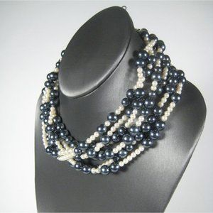 Imitation Pearl Necklace 20 Inch Silvertone Collar Beaded Statement Multi-Stran