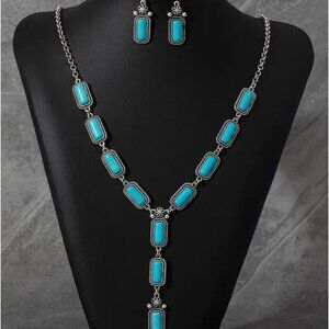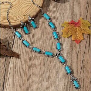 Imitation Turquoise Stone Necklace & Earring Set Boho Silver Tone