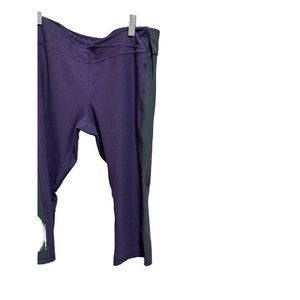 Eggplant and gray leggings/yoga pants. Capri length, gray mesh at the back of the knees. 88% polyester, 12% spandex, Machine wash cold. See photos for condition and measurements.