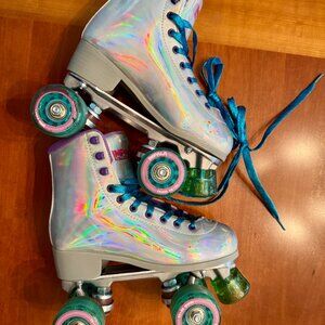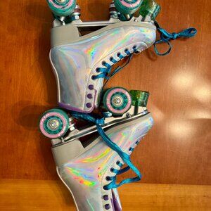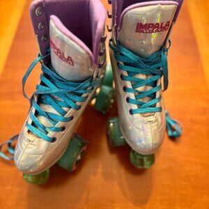 Impala holographic quad roller skates with blue tinsel laces. Used twice indoors only at a staking rink. Fun, comfortable and durable. Clean inside and out. Some very minor wear, still VGUC. Includes shoulder carry case.