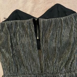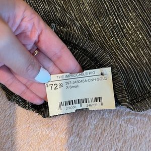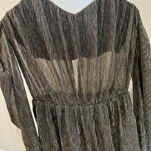 Impeccable pig romper! Never been worn, brand new would be perfect for New Year’s Eve or a fun party! Has a slightly sheer middle but fully lined built in bandeau, and bell sleeves! The frayed strings visible in the pictures are not part of the dress, just the straps used for hanging