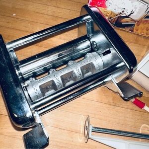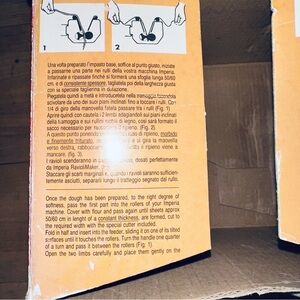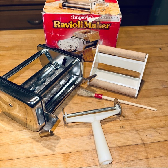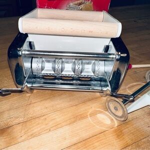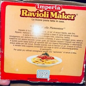 Imperia RavioliMaker for authentic homemade ravioli. Package contains the Imperia RavioliMaker attachment, feeder, pasta cutter, and cleaning brush. Imperia Ravioli Cutter Attachment for SP150 Pasta Maker. Made in Italy. Great piece of equipment for your kitchen. Buon Appetito!