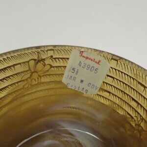 This really nice Caramel Slag Glass Honey Jar with Cover was made by Imperial Glass. This Honey Jar measures 5 1/2 inches high to the top of the lid with the lid on. It measures 3 1/2 inches in diameter at the base. Both the jar bottom and lid are in very good condition with no chips or cracks. The original label is attached. On the label is Imperial #43906 Slag. It is signed IG on the bottom. There are honey bees on the bottom and top.