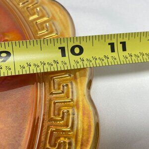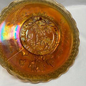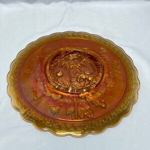 This Imperial Carnival Glass plate features a vibrant marigold hue with a sunflower design, adding a touch of elegance to your dining or display collection.