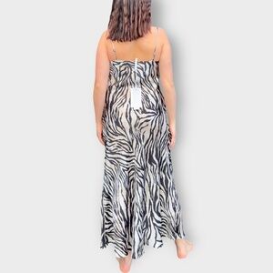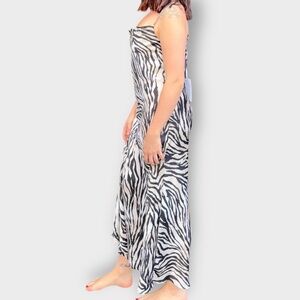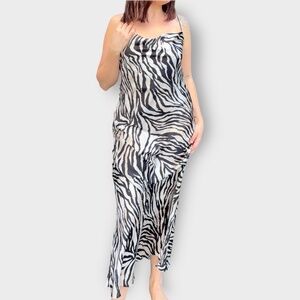 Stylish zebra print maxi dress. Features a bold black and white pattern. Perfect for any occasion. Has adjustable straps.