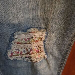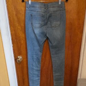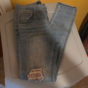 Trendy light blue skinny jeans with distressed details. Ideal for everyday wear.Great condition. Perfect for back to school. Cute patches on the knee under distress