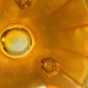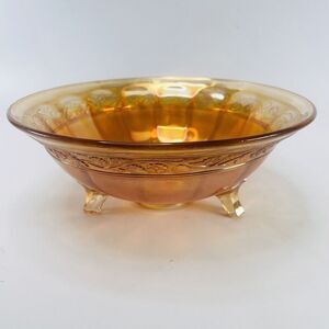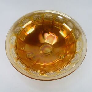 One of the glass feet is chipped. There are marks in the finish on the bottom of the inside of the bowl. Pictures provided of these imperfections. Please view them all. Imperial Glass Floral Optic Bowl Carnival Marigold Iridescent Three Footed VTG