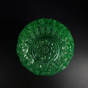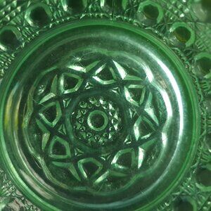 This uranium glass bowl boasts a vibrant green hue and a captivating open lace edge. Its intricate cane button pattern reflects light beautifully, adding charm.