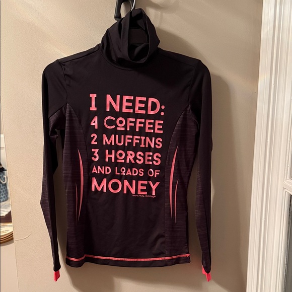Black long sleeve top with pink graphic text. Spandex, super soft and comfortable. Never worn, excellent condition. Turtleneck.