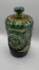 Elegant green glass jar with intricate patterns. Perfect for home decor.