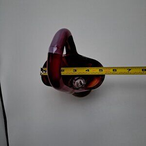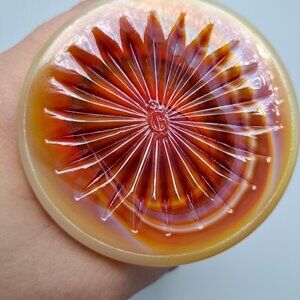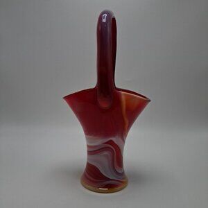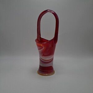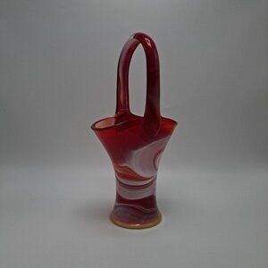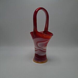 Beautifully crafted Imperial slag glass basket featuring a striking swirled red and white design, ideal for home decor or as a collectible item.