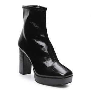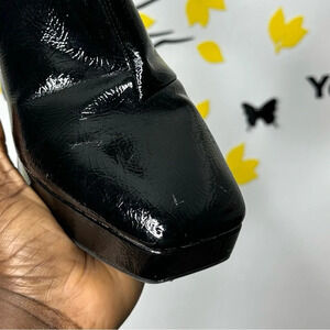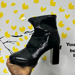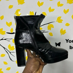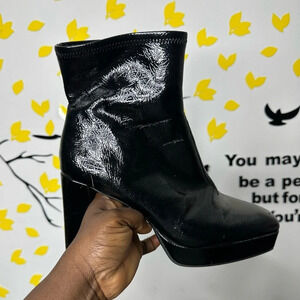 Sleek black ankle boots. Shiny finish. Chunky heel. Side zipper closure.