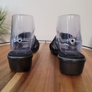 Black Strappy slip on sandals. Elastic straps make for a secure, comfy fit. Padded footbed. Short wedge like heels.