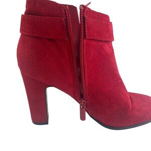 Elegant red suede ankle booties designed by Imp'o, featuring a stylish bow detail and convenient side zipper. Ideal for a sophisticated, polished look.